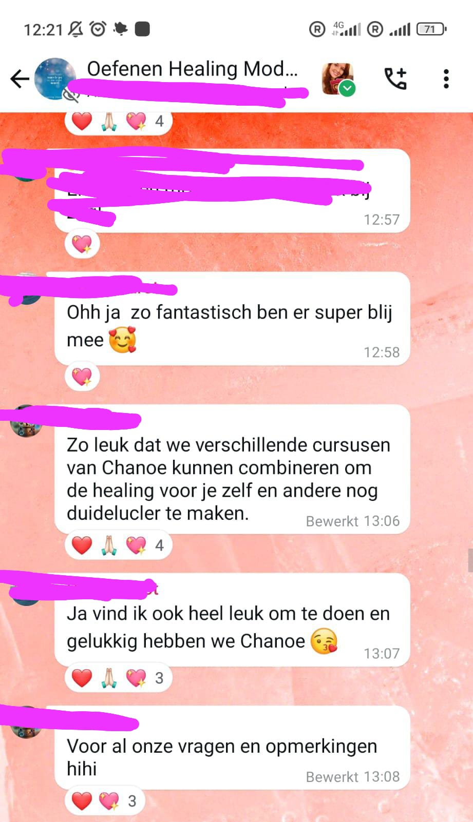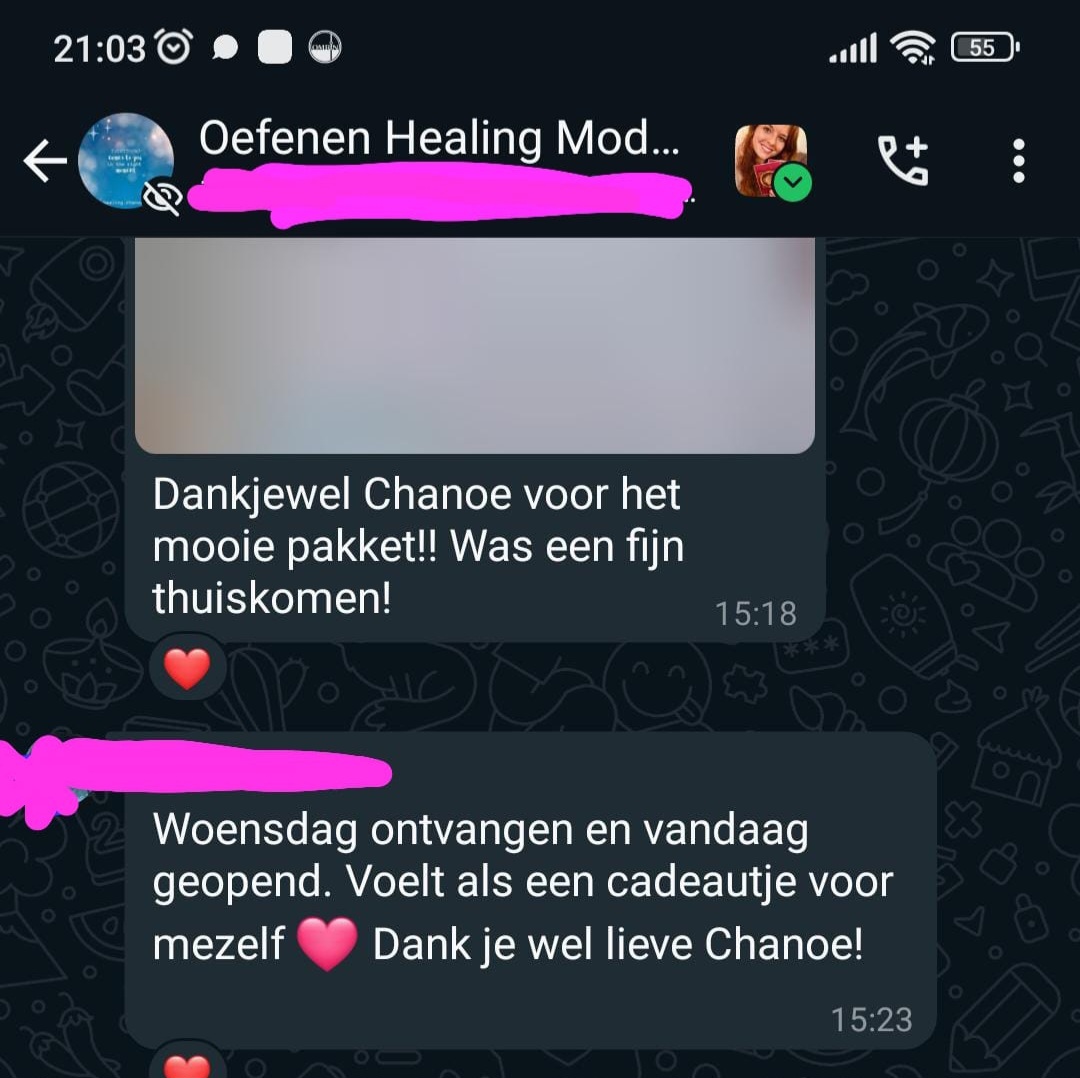 ✓ een groep via Whatsapp waarmee je kunt uitwisselen. Dit kan in de vorm van Live sessies (via bijv. videobellen) of op afstand (verslag versturen via Whatsapp). Het uitwisselen hoeft niet altijd direct te gebeuren, je kunt ook gewoon eens vragen (als je bijv. niet zo lekker in je vel zit) of iemand een sessie op je wilt doen. Bedenk eens hoeveel geld je hiermee bespaart en wat het je uiteindelijk brengt.
